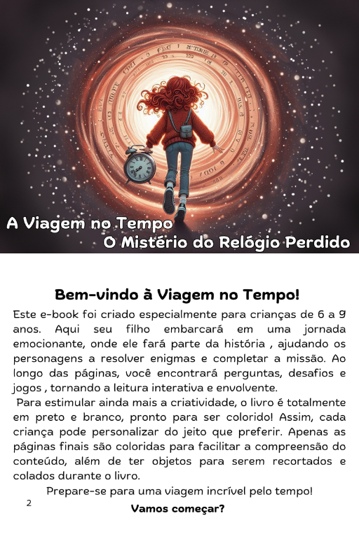 Por isso, nosso e-book “A Viagem no Tempo: O Mistério do Relógio Perdido” é baseado em um método inovador que combina aprendizagem ativa, gamificação e contação de histórias para criar uma experiência única e educativa para seu filho.